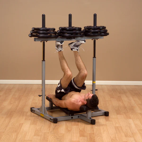 The Powerline Vertical Leg Press provides an impressive platform for obtaining huge muscle gains through isolated lower body workouts. The unique vertical design not only reinforces support for your back and hips, but also minimizes space used to perform the exercises. Extra-thick back pad and contoured head and neck pad lock you into the proper exercise position while providing comfort during your leg press or calf raise routines. Features include dual adjustable 1/2" steel locking pins, three different starting and stopping positions and a diamond plate steel press deck for no-slip control. Three 1" standard plate posts allow increased resistance for a progressive challenge every time you work out. The PVLP56W is crafted of durable alloy steel with an extremely tough powder coat finish. 400 lb. weight capacity. Olympic adapter sleeves are optional. Weight plate posts are 1" dia. Shown with optional Olympic Adapter Sleeves.