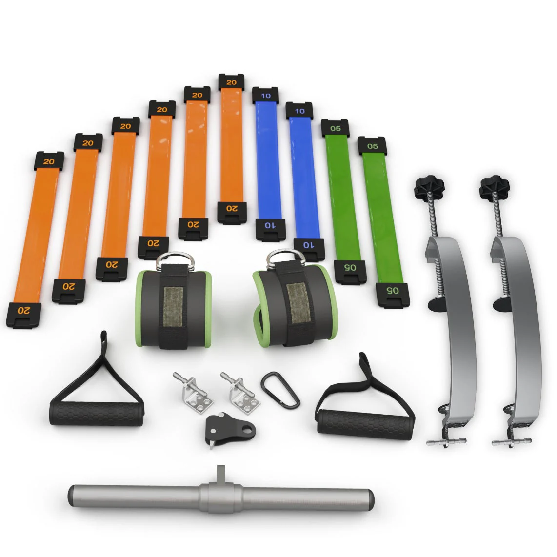 TUT Trainer™ Tower, Aluminum Curl Bar, Carabiner, Wall Mount Plates, Ankle Straps (2), Single Handles (2), Rope Lock, 150 lbs of TUT Plates™ - Resistance Bands (6 x 20lbs; 2 x 10lbs; 2 x 5lbs), Door Clamps
